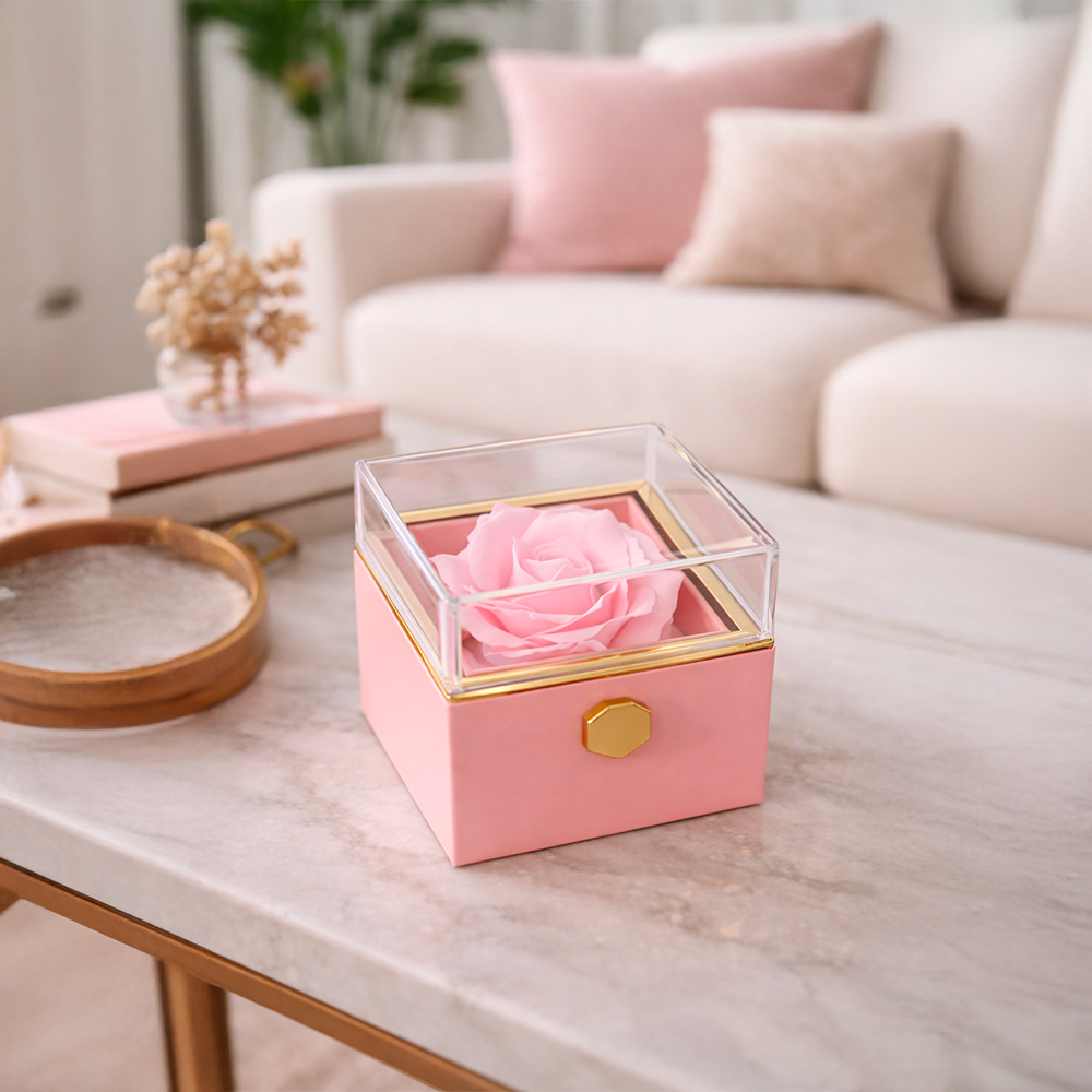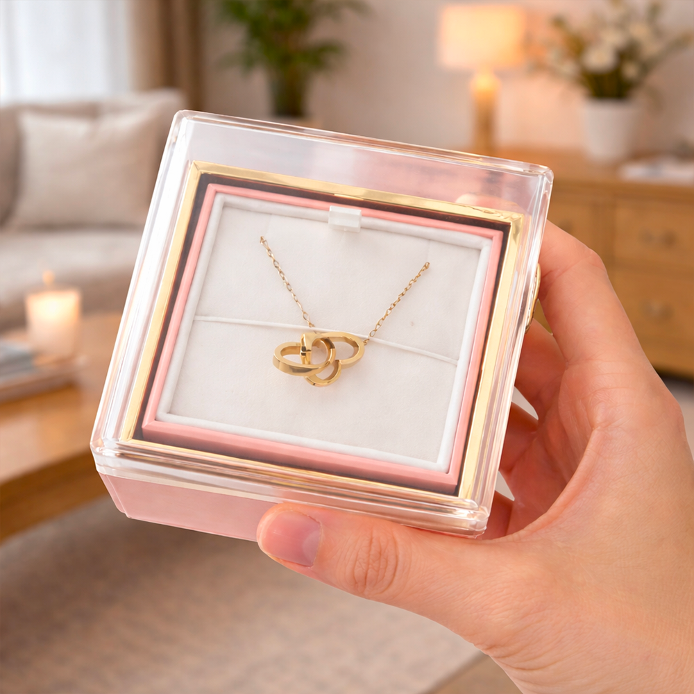 Cette rose éternelle, présentée dans un coffret élégant, cache un bijou cœur entrelacé, symbole de deux âmes liées à jamais.