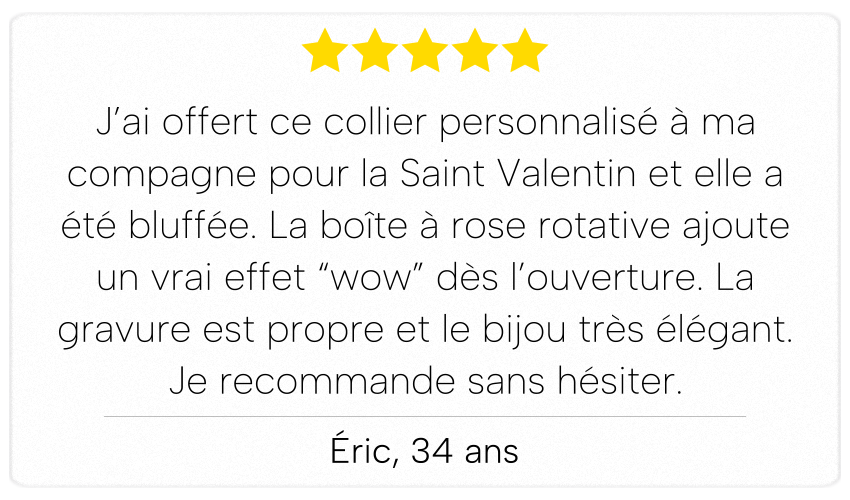 Le collier est personnalisable, pour graver un prénom, une date ou un message unique et rendre ce cadeau totalement inoubliable.